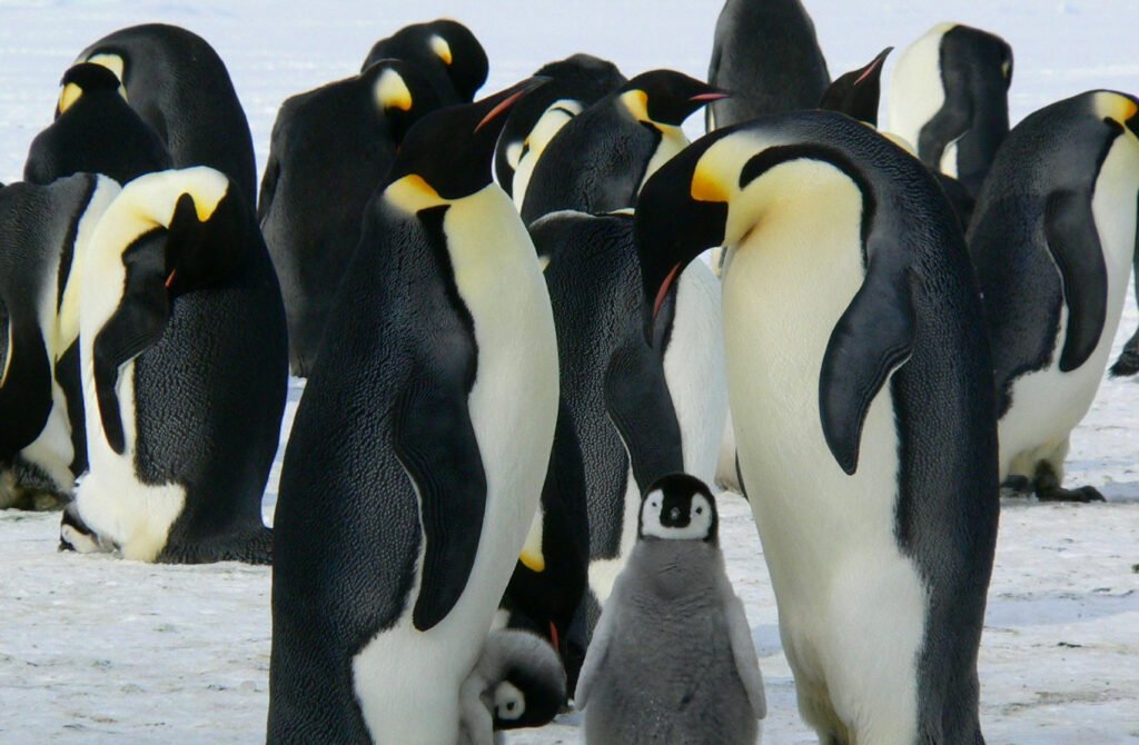 - Special adaptations to survive temperatures of up to -60ºC: scale-like feathers + insulating body fat + reduction of metabolism & blood flow + they form vast colonies where adults take turns to be at the coldest and windiest outermost layer.
