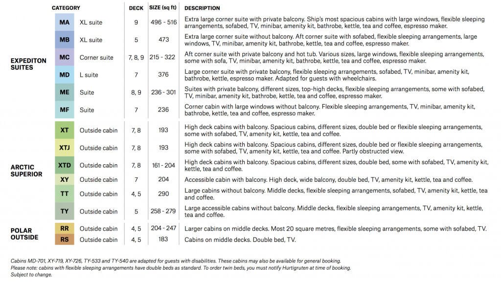 All the suites and cabins feature fine Scandinavian materials and provide premium comfort for a great night’s sleep after a day of exploration. All cabins and suites are outside for excellent views. See cabin details on Notes.