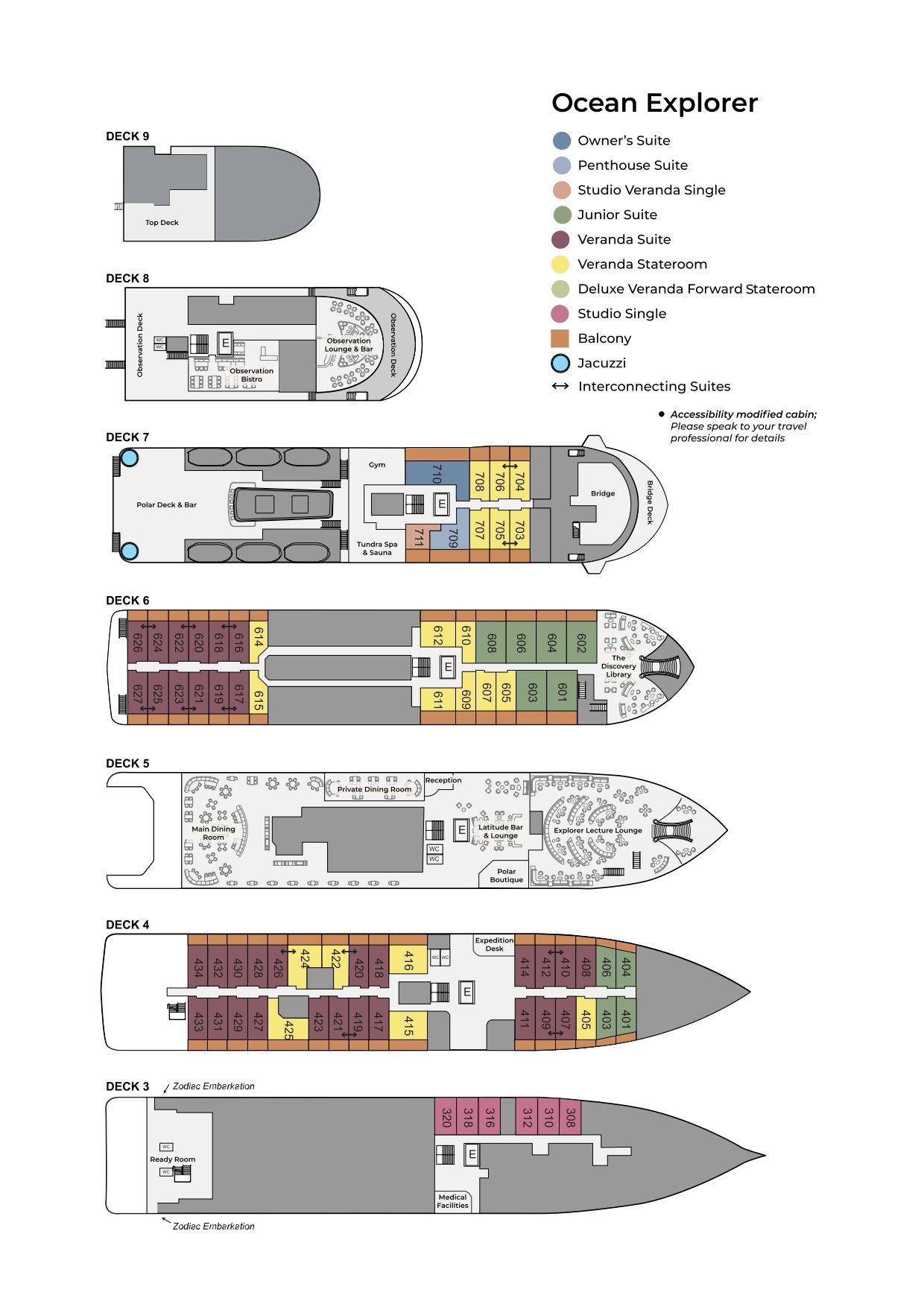 Ocean Explorer features ample outdoor viewing areas and multi-height outer decks, which are ideal for long-view photography and wildlife viewing. The vessel is equipped with a fleet of 15 Zodiacs that enable guests to get off the ship quickly and safely for off-ship adventures. In addition to the well-appointed and spacious public areas, Ocean Explorer has an industry-leading mix of sustainability systems, including fuel-efficient Rolls Royce engines.