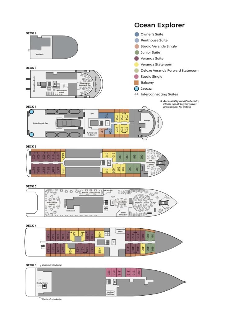 Ocean Explorer features ample outdoor viewing areas and multi-height outer decks, which are ideal for long-view photography and wildlife viewing. The vessel is equipped with a fleet of 15 Zodiacs that enable guests to get off the ship quickly and safely for off-ship adventures. In addition to the well-appointed and spacious public areas, Ocean Explorer has an industry-leading mix of sustainability systems, including fuel-efficient Rolls Royce engines.