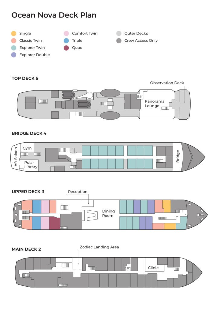 The Ocean Nova is one of the most fuel-efficient vessels operating in the Polar Regions, carrying 80 passengers in 34 cabins, each with a sea view and private facilities. The ship was completely refurbished in 2006, and it is extremely quiet and highly maneuverable. The Ocean Nova has a spectacular observation lounge with full view windows, the latest lecture and presentation equipment, and a complete bar. The aft library/lounge has wrap-around windows, comfortable chairs and a complete Polar library.