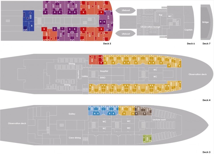 The vessel has the highest ice-class notation (UL1 equivalent to 1A) and is therefore very suitable to navigate in solid one-year sea ice and loose multi-year pack ice. Ortelius is a great expedition vessel for 100 passengers with lots of open-deck spaces and a very large bridge which is accessible to the passengers. Ortelius offers a comfortable hotel standard, with two restaurants, a bar, lecture room and a sauna.