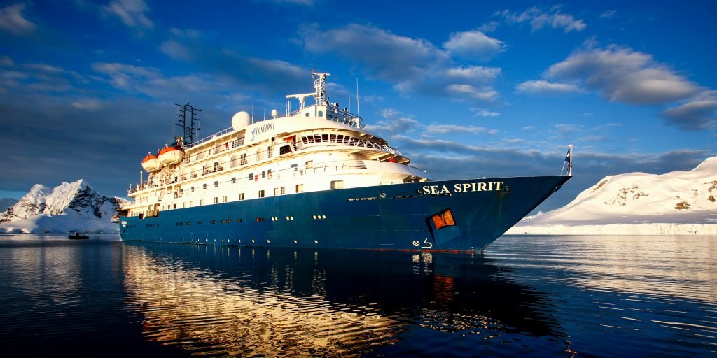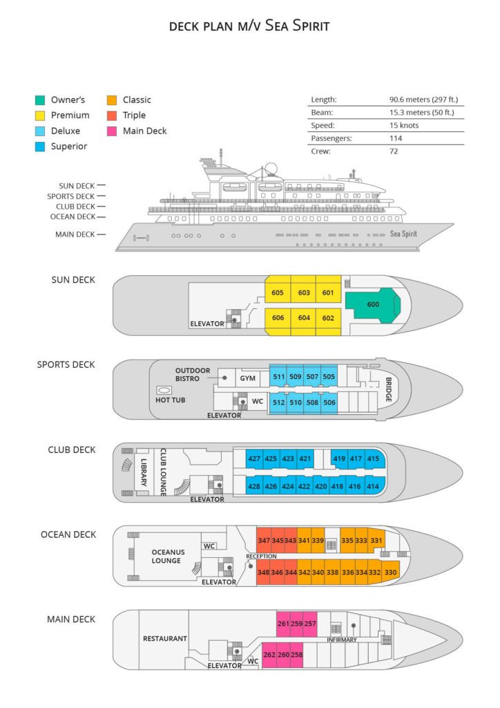 Carrying a maximum of 114 passengers, this outstanding vessel combines luxury with expedition cruising. All cabins have facilities en suite, king-size beds and exterior views. She boasts all the amenities of a fine hotel, including an open bar, balconies in the suites and a hot tub on level 5. The Sea Spirit is a luxurious expedition vessel that seamlessly dispatches zodiacs and kayaks for excursions and exploration.