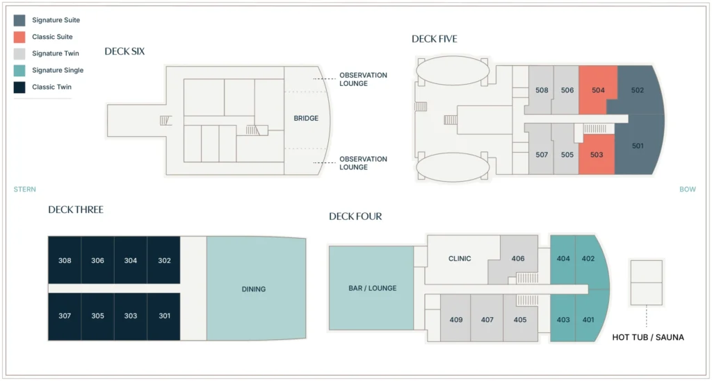 - All cabins are exterior, with porthole windows