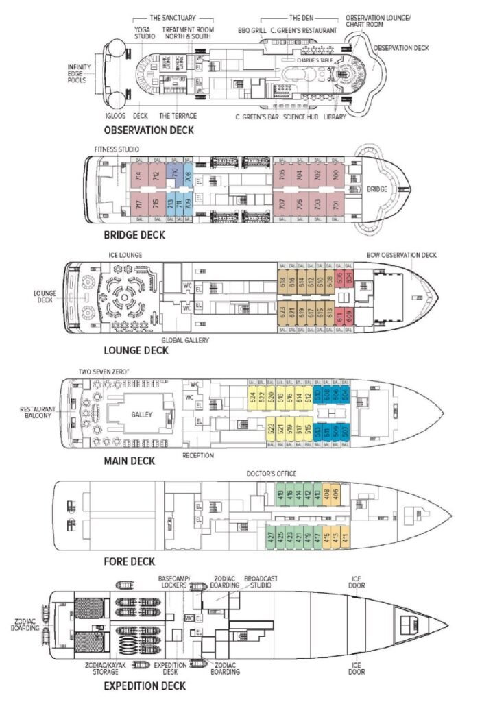 Reception; three dining areas; an observation lounge with bar, gym, wellness area, infinity-style outdoor hot tubs with adjacent igloos; library; main lounge with full service bar, 24-hour beverage station,state-of-the- art tech for films/presentations; B&H Photo locker and a photo workshop area; science hub; an onboard broadcast studio; an expedition base with lockers for expedition gear; and open access to the Bridge, Captain, officers and on-duty wildlife spotters.